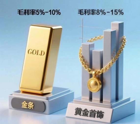 在高金价下,消费者的偏好从装饰性首饰迅速转向投资性金条。虽然金条销量上升,但其毛利率远低于黄金饰品。