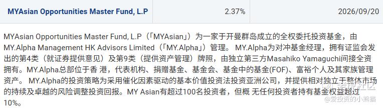 注册于开曼群岛的亚洲机会主题基金,聚焦亚太地区高成长资产配置,是典型的海外对冲基金,参与多家港股及中概股IPO投资。
