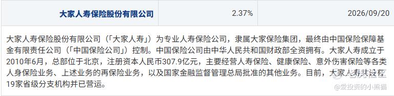 大家保险集团旗下寿险子公司,前身为安邦人寿,由中国保险保障基金、中石化、上汽集团等“国家队”股东重组而成,是国资背景的大型险企,偏好长期价值投资。