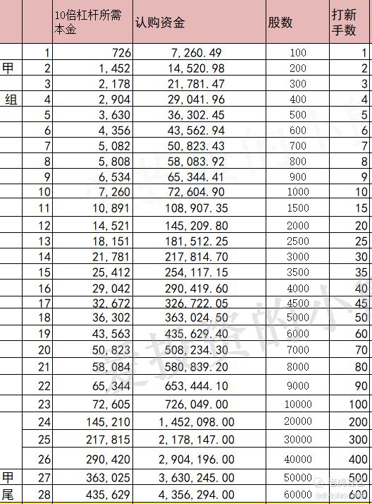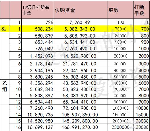 这个票甲尾436万,乙头需要认购资金509万,乙组的各档融资所需要的本金还有融资金额对应如下表: