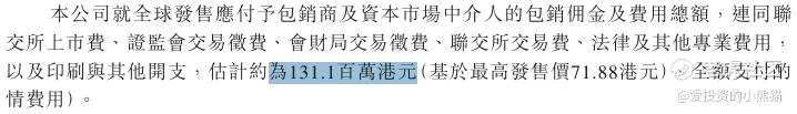 然后这个票招股书上按发售价71.88港元计算,公开的上市所有开支总额约为1.31亿港元,募资额约33.06亿港元,占比约3.97%,开支相比募资额算是比较少了。