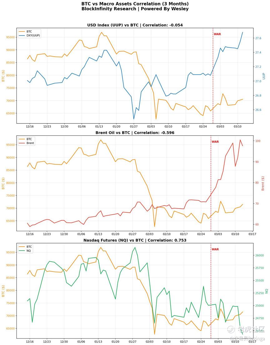 给兄弟们解释一下这幅图,这是比特币和美元指数、原油还有纳斯达克的相关性。截取的时间点是二月底,也就是这次美伊战争爆发的时间点。