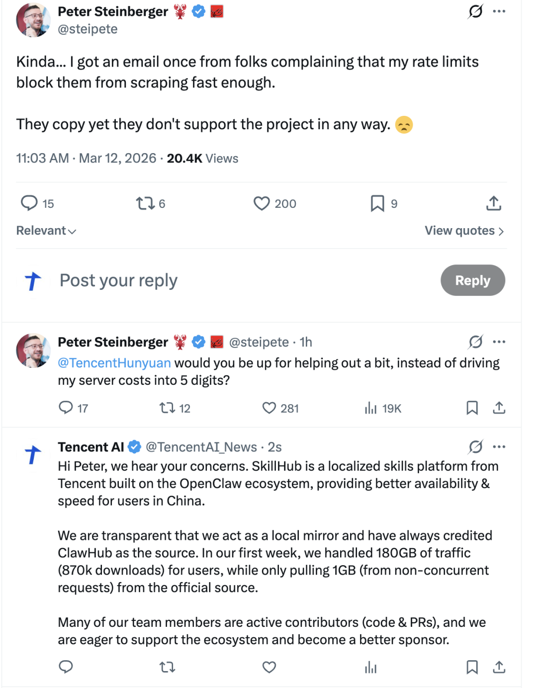 OpenClaw创始人彼得·斯坦伯格(Peter Steinberger),公开发文抱怨:“(腾讯)只会照搬抄袭,却没有以任何形式提供过支持。”