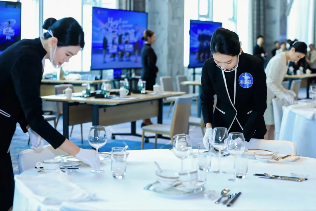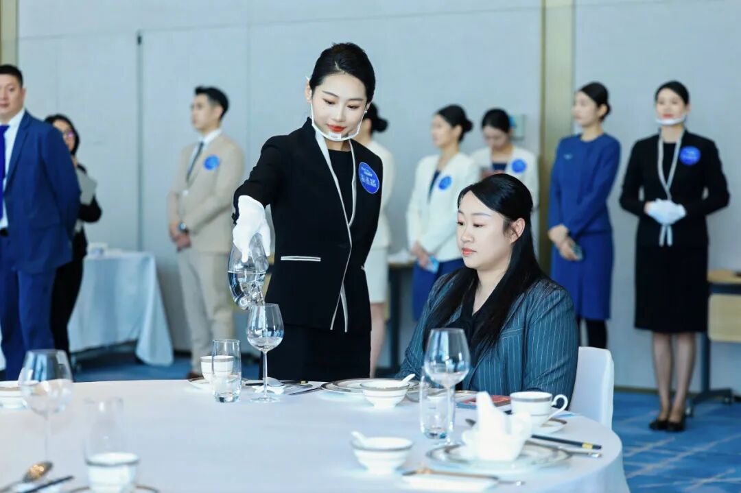高规格的国际接待,最终要落地在扎实的基本功上。大众赛环节侧重基础服务的标准化与规范化,通过团队展示、楼宇温度设计展示、车轮战抢答赛、国际急救技能考核、会务及宴会摆台、上茶倒酒展示等环节,全方位检验选手的日常服务功底。