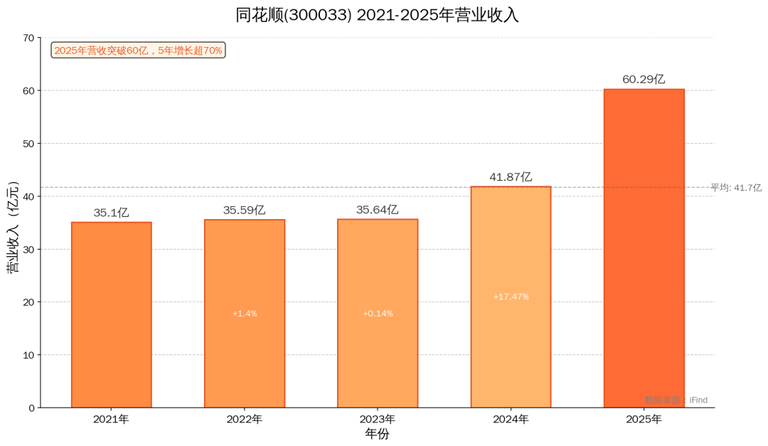 从2021年的35.10亿元,到2022年和2023年的平台期,再到2024年开始加速,2025年彻底爆发达到60.29亿元,同比增长44%。5年时间,营收增幅超过70%,这在金融软件行业绝对算得上"高速增长"。