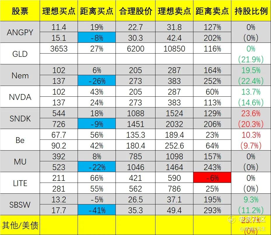 $英伟达(NVDA)$ 13.7%, $闪迪(SNDK)$ 23.6%, $纽曼矿业(NEM)$ 19.5%,SBSW 9.3%,BE 10.3%,现金/美债 23.7%。