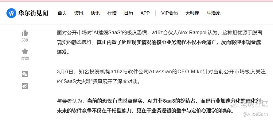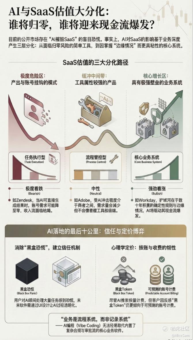 通过这个场景预演,我们可以清楚看到,当AI替代人力,席位需求就下降了,SaaS公司为保收入涨价,继而就加速客户转向AI原生方案,一旦客户预算收缩,优先砍掉的就是那些"非核心"独立SaaS。当然,不能一杠子打翻整个SaaS, 有些真牛,或者真幸运的,还是可以继续水润的生存下去的。例如,下图是从华尔街新闻里借来的,三大分化路径就在那等着,看谁能找到路,就能继续留在牌桌上。