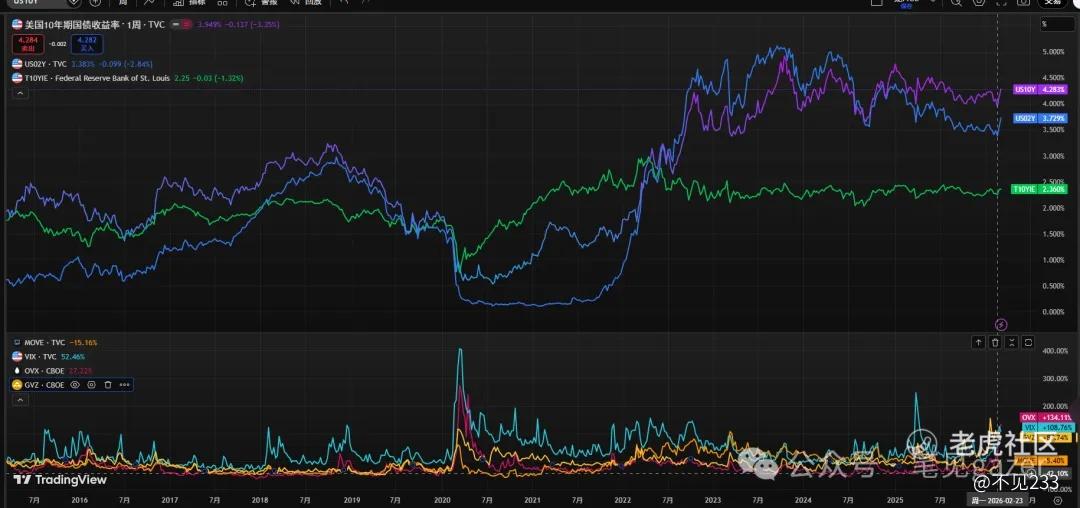 TIPs稳定长端预期,美债结构虽然有飙升,还是年线级别的收敛大三角中,理论上不会打破后疫情时代高债务+AI生产力的将信将疑的结构(25.10.23《流动性风险前瞻》),但债股-商品(黄金、原油)的波动率都共振到高位···