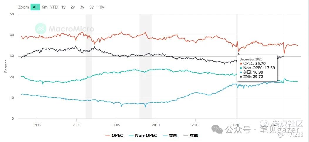 PS过去十年页岩油革命后,美国从原油进口国转为出口国,随之OPCE+&其他原油体系份额下降,这轮美伊战争后大概率又是一个宏观周期的拐点。