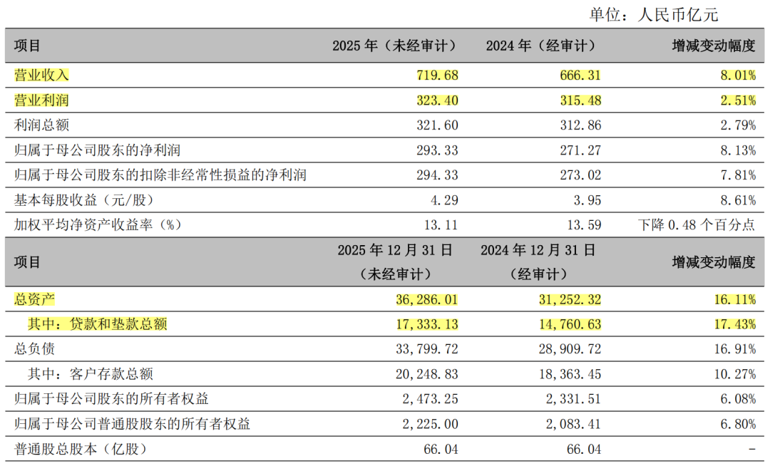 2025年,中国银行业依然面临息差挑战,但宁波银行继续逆势增长,营业收入719.68亿元,同比增长8.01%,归属净利润293.33亿元,同比增长8.13%。