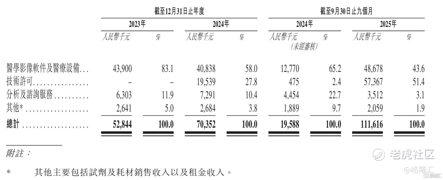 产品研发落地到市场突破持续扩张,最终也转化为爆发式增长的业绩数据。招股书显示,公司总收入从2023年的人民币5284.4万元增长至2024年的7035.2万元,同比增长33.1%;2025年前九个月营收进一步飙升至1.12亿元,较上年同期的1958.8万元增长469.8%, 意味着公司的技术壁垒已经成功转化为市场竞争力与商业化能力。从收入结构看,2025年前三季度大模型技术许可收入占比达51.4%,一跃成为第一大收入来源,而医学影像软件及医疗设备收入也同比增长281.2%。盈利方面,公司毛利率保持行业较高水平,2023年、2024年及2025年1-9月分别为71.0%、65.5%及75.9%,其中大模型技术许可业务毛利率高达96.5%,该项既是第一大收入来源,又具备高毛利特性,彰显核心技术的高附加值。 强劲的财务表现,也为后续全国医院普及落地、全球化业务拓展奠定稳固的财务基础。