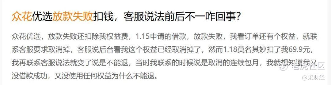 亦有用户反映,在众花优选放款失败,但仍然被扣了69.9元所谓“权益费”,联系客服说是不能退。