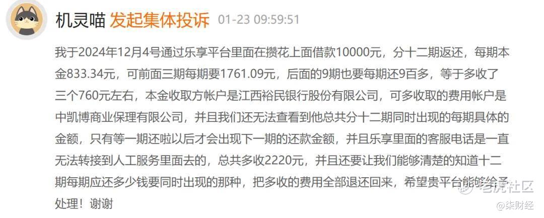 另有消费者在黑猫投诉发起集体投诉:通过乐享借在攒花借款10000元,分12期还款,每期本金833.34元。但前三期每期需还1761.09元,后九期每期900多元,累计多收2220元。本金由江西裕民银行收取,多收费用却进入中凯博商业保理有限公司账户,且还款计划不透明,需还完一期才能看到下期金额。