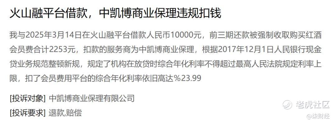 比如,有用户投诉,在火山融平台借款10000元,前三期还款中被强制收取“购买红酒会员费”合计2253元,扣款方为中凯博商业保理有限公司。