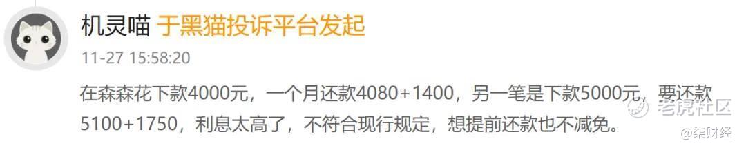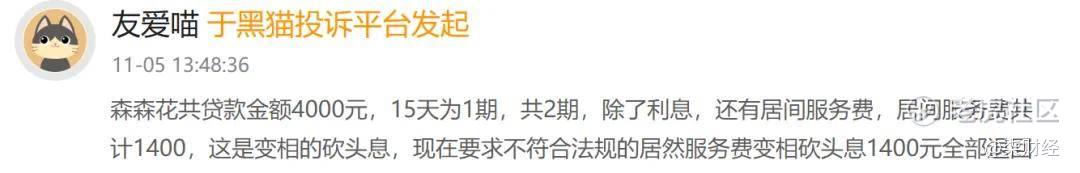代表性案例便是森森花。多名用户在黑猫投诉上发帖称:在森森花借款6000元,期限一个月,被收取2000元手续费和55元利息,核算下来年化利率远超36%;
