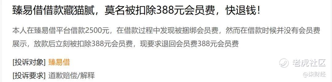 黑猫投诉上,10多条投诉直指臻易借暗藏“猫腻”,即在用户借款时无任何费用提示,放款后却立刻被扣除数百元不等的“会员费”。