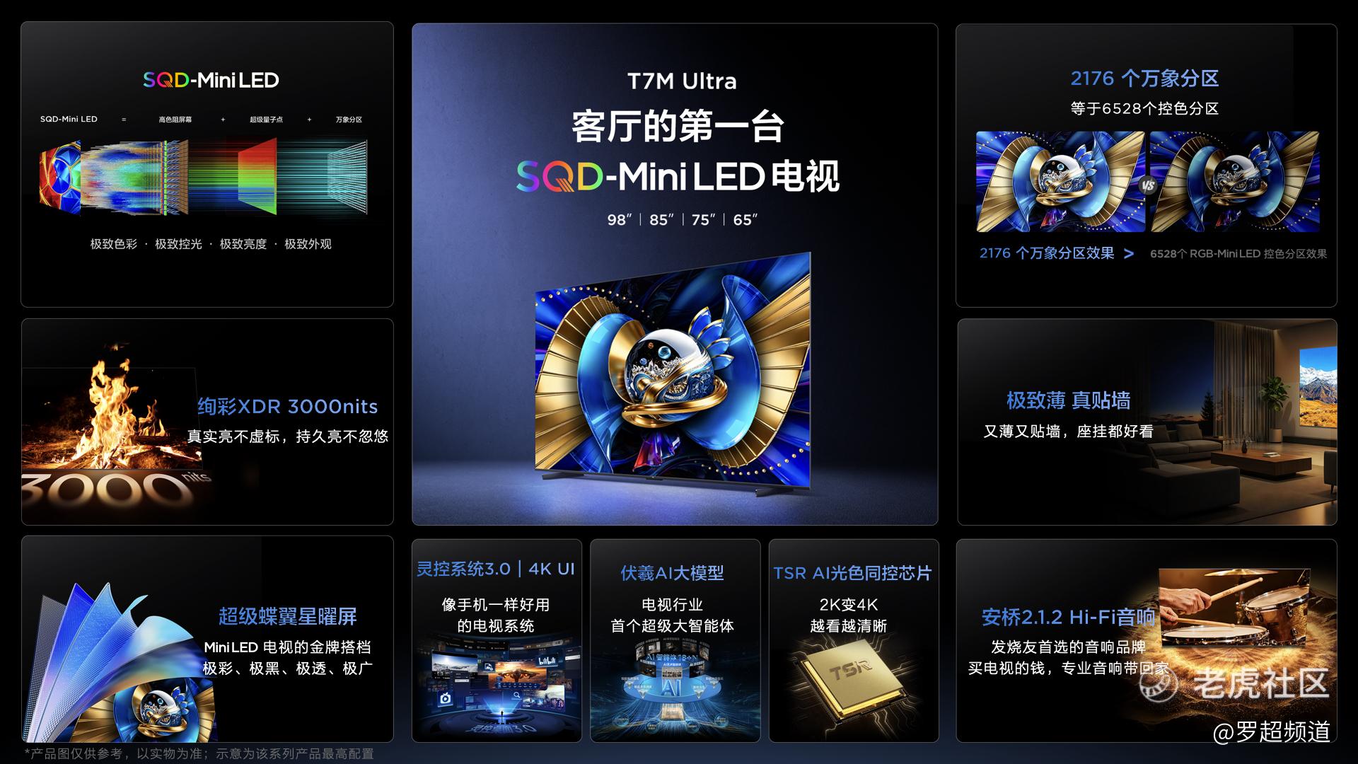 与此同时,TCL还发布了另一个系列的新品T7M Ultra和T7M Pro,它们同样是SQD-Mini LED电视,同样有100% BT.2020色域覆盖、150Hz高刷、满血接口等,核心参数和Q9M Pro一致。