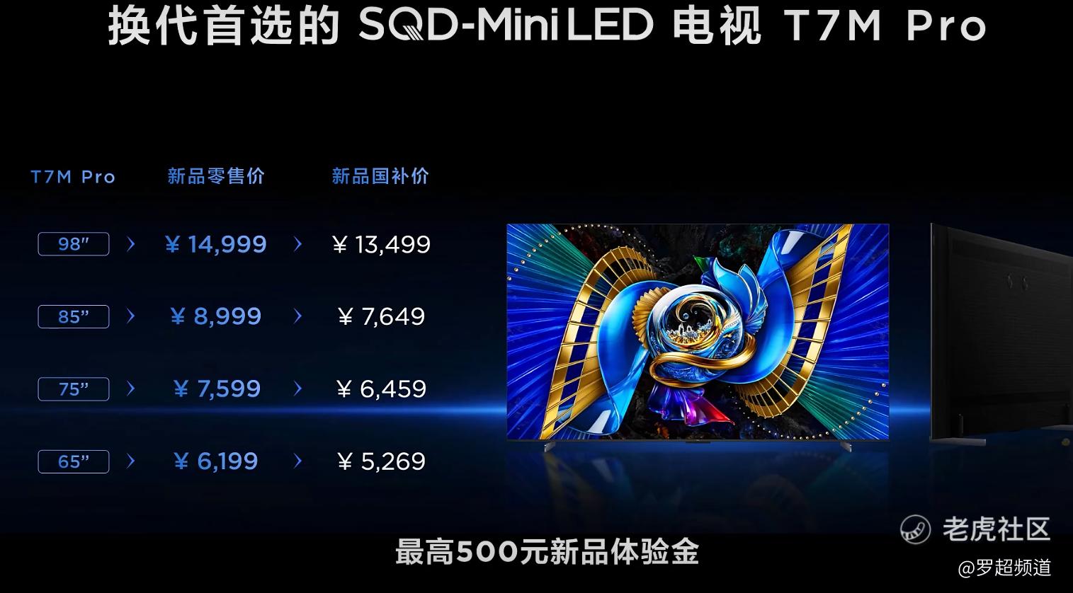 不过,它们的峰值亮度略低一些,提供了四个尺寸,65英寸起,相比Q9M Pro同尺寸价格也更低一些。T7M Ultra起售价6799元,国补价5779元;T7M Pro起售价6199元,国补价5269元。如果你想要一台Mini LED电视,同时对尺寸要求更高,那么T7M Ultra会比较适合你。