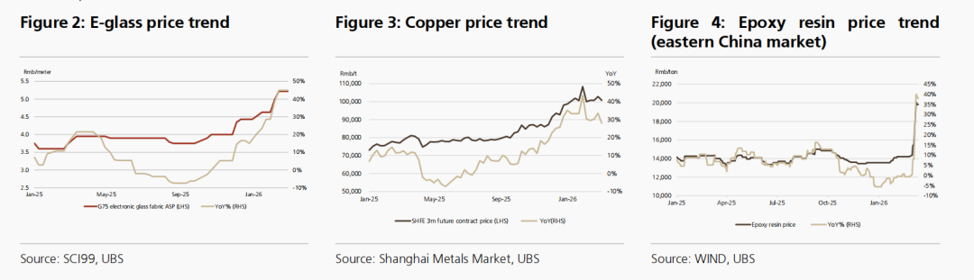 由成本上涨驱动的CCL定价周期已经开始。在CCL的三种关键原材料中,玻璃布供应最为紧张,价格上涨压力同时波及高端低介电常数/低热膨胀系数玻纤布和通用级E-玻璃布(截至2月26日上涨18%)。铜箔紧张仅限高端产品,尽管加工费年内迄今涨幅超过15%,同时铜价本身也在上涨。树脂供应仍然宽松,但近期价格出现波动上扬(见图表4)。成本传导在低端与高端CCL产品之间出现分化。年初至今,传统FR-4供应商已多次向PCB客户发出涨价通知,要求提价10-20%,且可能进一步调整,而与AI相关的高速CCL价格保持稳定。CCL供应商正通过吸收成本上涨来换取在关键客户的稳定份额;更高的AI业务利润率为其提供了缓冲空间。