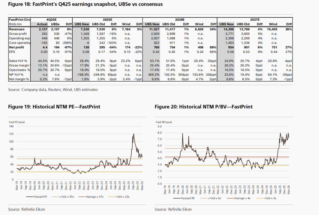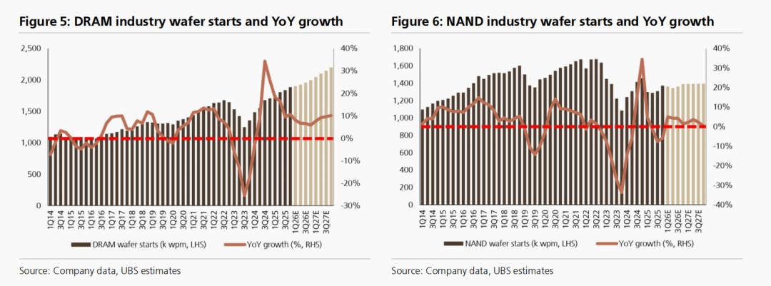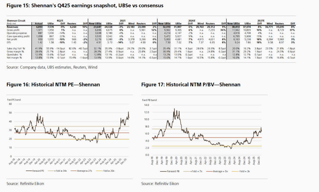 我们认为,深南电路和兴森科技的BT基板工厂自2025年第二季度以来实现满产运营及毛利率恢复,已经开始贡献利润增长,但2025年末的提价幅度仍滞后于原材料成本上涨。我们相信两者都将在未来几个季度跟进提价,BT基板在2026年上半年预计将有进一步的利润上行空间。我们的调研显示,中国BT基板制造商的在手订单已排至2026年6-7月,并且随着存储需求保持稳定,我们预计高产能利用率将维持到年底。瑞银科技团队目前预测,2026年第一季度DDR/NAND合约价将环比上涨72%/65%,较此前预测的+62%/+40%有所上调。对于2026年第二季度,我们现在预测DDR合约价格将再环比上涨40%(此前为+15%),NAND环比上涨30%(此前为+15%)。我们预计DDR/NAND的上行周期将分别持续至2027年第四季度/2027年第二季度,这可能为深南电路和兴森科技的BT基板带来更长(30%及以上)的毛利率上行周期。