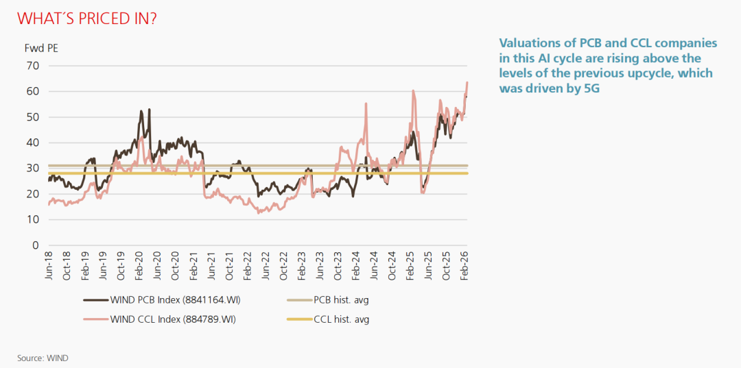 中国PCB/CCL行业在2025年再创强劲表现,多家公司预披露了稳健增长的盈利;市场普遍预计PCB指数(8841164.WI)2025年销售/盈利同比增长30%/74%,CCL指数(884789.WI)销售/盈利同比增长46%/147%。中国PCB/CCL指数在2025年增长71%/121%后,年初至今进一步上涨18%/23%。PCB和CCL板块的12个月前瞻市盈率均高于58倍,较2018年以来的平均值高出+3.5/+2.8个标准差。
