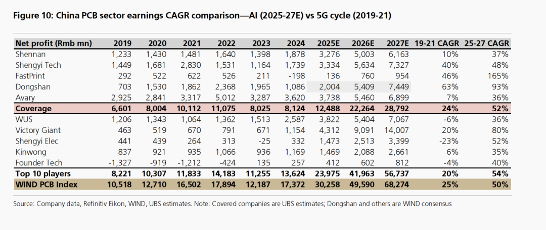 我们通过对标中国PCB行业上一个上行周期——2019-21年的5G周期(前瞻市盈率20-50倍)来评估当前处于AI周期的哪个阶段。我们认为AI周期在规格升级和出货量带来的内容价值方面具有相似的增长驱动力,但全球市场规模更大,推动实质市场规模成倍扩张。我们预计AI将驱动服务器PCB需求扩张5-10倍,显著高于4G到5G网络升级期间的2-3倍。我们预测所覆盖公司在2025-27年的盈利年复合增长率(CAGR)为52%,而5G周期2019-21年为24%,略高于市场对中国PCB指数CAGR的普遍预期。