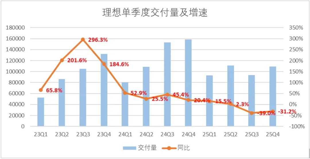 理想汽车四季度累计交付10.92万辆车,同比下降了31.2%,全年累计交付40.6万辆车,同比下降18.8%。
