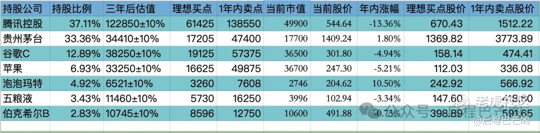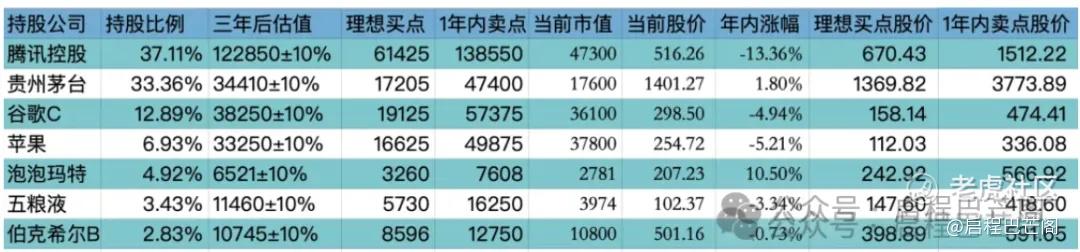 目前十大持仓:腾讯37.11%,贵州茅台33.36%,谷歌12.89%,苹果6.93%,泡泡玛特4.92%,五粮液3.43%,伯克希尔2.83%。目前九大持仓占比88%(其中科技股占比56.93%,白酒股占比36.79%;A股占比36.79%,港股占比42.03%,美股占比22.65%),还有12%观察仓和现金。