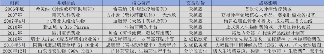 而最引人注目的一次收购,莫过于2018年5月绿叶制药以5.46亿美元的价格,收购了阿斯利康抗精神病药物思瑞康在全球51个国家和地区的业务。这次收购不仅大幅提升了绿叶制药中枢神经系统产品线的实力,更进一步扩大了其国际化市场版图,推动公司向全球化药企迈出重要一步。