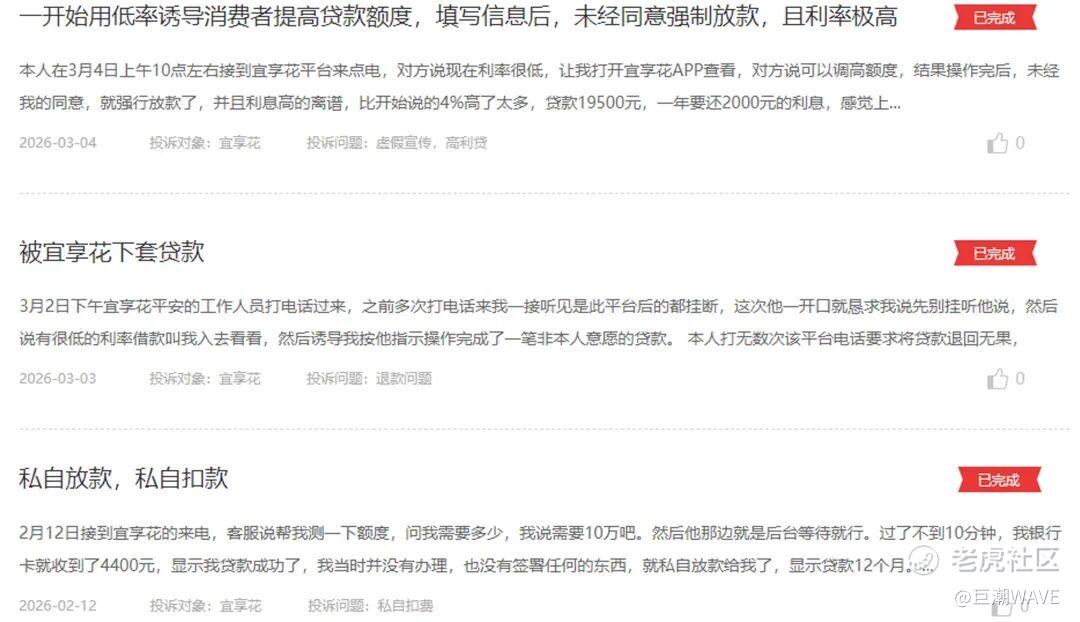 有用户在投诉中表示,宜享花方面“一开始用低利率诱导消费者提高贷款额度,填写信息后,未经同意强制放款”;也有用户表示,有工作人员“恳求我说先别挂听他说”,然后以低利率诱导完成贷款;更有用户表示,“没有签署任何东西,就私自放款给我了”。