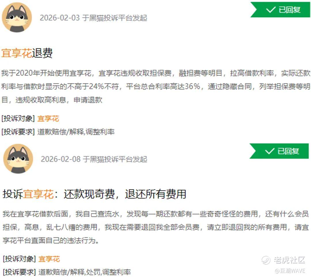 在投诉平台和各种社交媒体上,有大量对宜享花通过暗扣服务费、会员费、担保费等方式,变相提高借款人融资成本的抱怨。不少用户都在反映,宜享花的实际年化利率已经远超24%的监管上限,高达36%的综合利率也比比皆是。