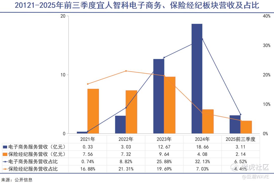 保险经纪业务方面,宜人智科在2020年收购了合翔保险经纪公司,但其规模持续萎缩,2025年第三季度,保险经纪业务营收8420万元。前三季度营收总和仅为2.14亿元,占公司总营收的比重不足5%,对公司的盈利贡献微乎其微。