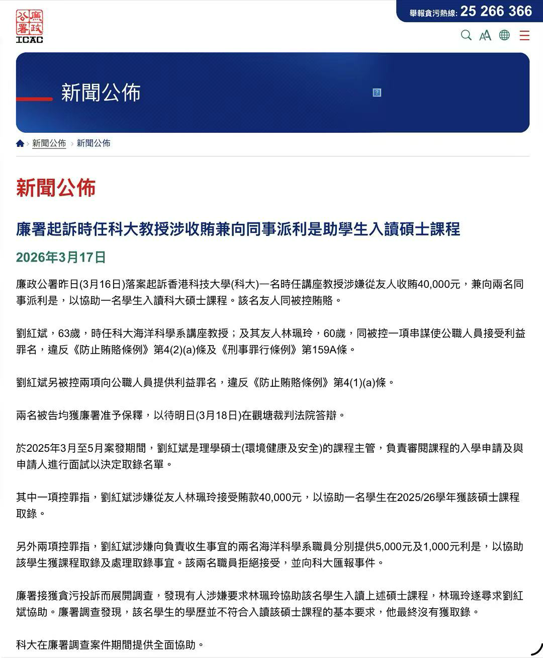 这是香港廉政公署(ICAC)于 2026 年 3 月 17 日发布的新闻公告,内容为起诉香港科技大学一名时任讲座教授,涉嫌收贿并向同事派利是,以协助不符合入学要求的学生入读硕士课程。