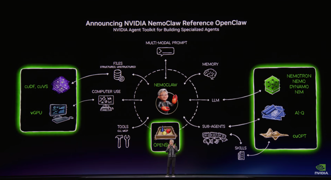 昨晚最吸睛环节:黄仁勋现场演示用NemoClaw/OpenClaw智能体基础设施,"一键"部署AI代理,控制机器人完成养虾全流程(喂食、监测、调控)。