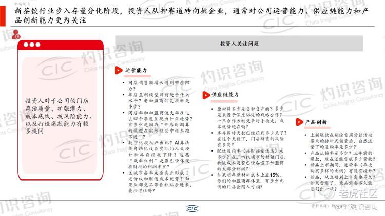 开年至今,行业内已经有多笔融资事件发生,且多聚焦细分赛道龙头,从投资人关注问题来看,投资人从押赛道转向挑企业,通常对公司运营能力、供应链能力和产品创新能力更为关注。资本不再为“新鲜感”长期买单,更关注已验证的商业模式和组织能力。当情绪红利退场,资本更愿意投向高频、标准化、可规模复制的品牌。未来,政策利好、资本加持将不断推动现制茶饮行业的供应链一体化建设与三产融合升级,现制茶饮行业整体竞争力将不断提升。