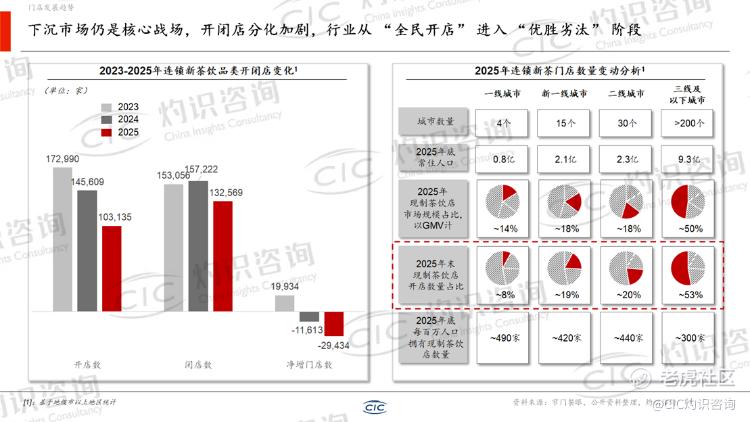 2025年新茶饮线下门店格局迎来关键转折,行业从 “全民开店”迈入“优胜劣汰”的存量深耕阶段。根据CIC 灼识咨询的统计,2023-2025年,连锁新茶饮净增门店数由正转负,2025年净减近3万家,粗放拓店模式不再奏效;同时2025年二线以下城市茶饮开店数、及GMV占比均超50%,结合人均拥有奶茶店数量来看,高线城市的市场也已趋于饱和,下沉市场依旧是品牌破局增量的核心战场,行业告别跑马圈地,转向精细化运营与价值挖掘。