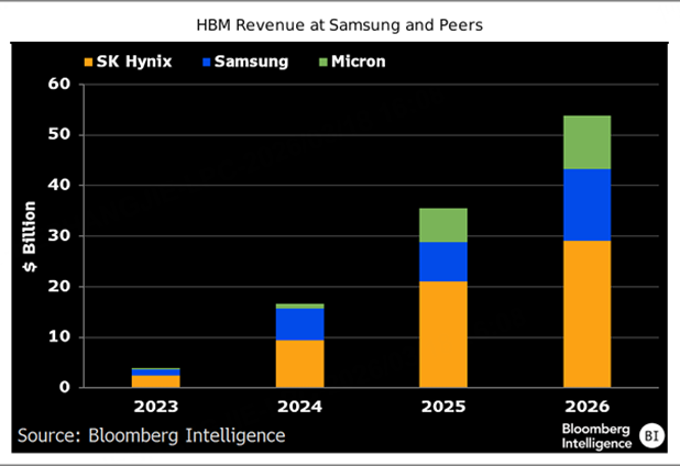 HBM收入在2023到2026年持续增长,SK海力士规模最大,2026年接近300亿美元,高于三星与美光。收入增长路径非常清晰: