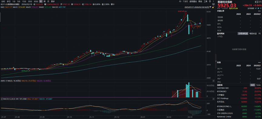 韩股盘中触发熔断,KOSPI指数上涨5.04%,其中三星电子上涨近6.8%,SK海力士上涨约7.9%,两家公司成为带动大盘的主要推动力量。