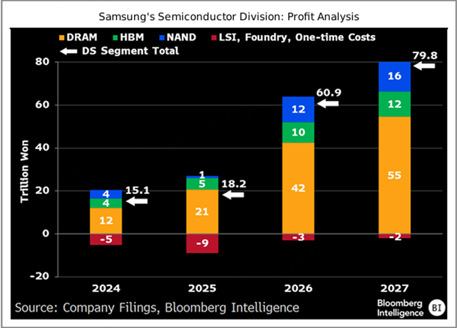 三星半导体利润增长主要来自DRAM,2026年贡献约42万亿韩元,远高于HBM和NAND。价格上行后,利润被直接放大,这一变化被市场提前计入估值: