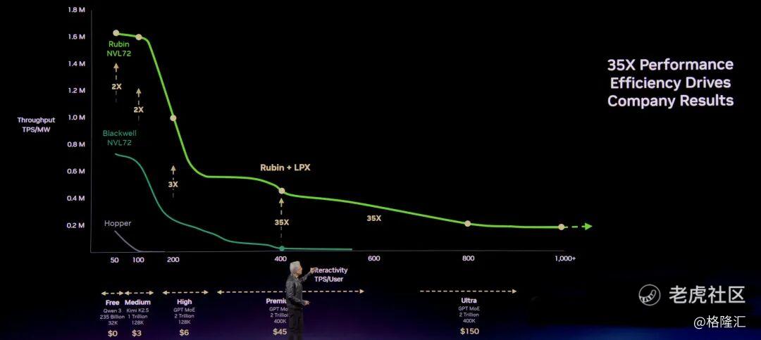 除此之外,NVIDIA推出的Groq 3 LPX机架专门针对低延迟、长上下文的代理系统设计,凭借其500MB片上SRAM和40 PB/s的显存带宽,能够绕过外部显存,实现几乎瞬时的Token产出与Blackwell平台相比,这种联合设计实现了35倍的每瓦特推理性能提升。