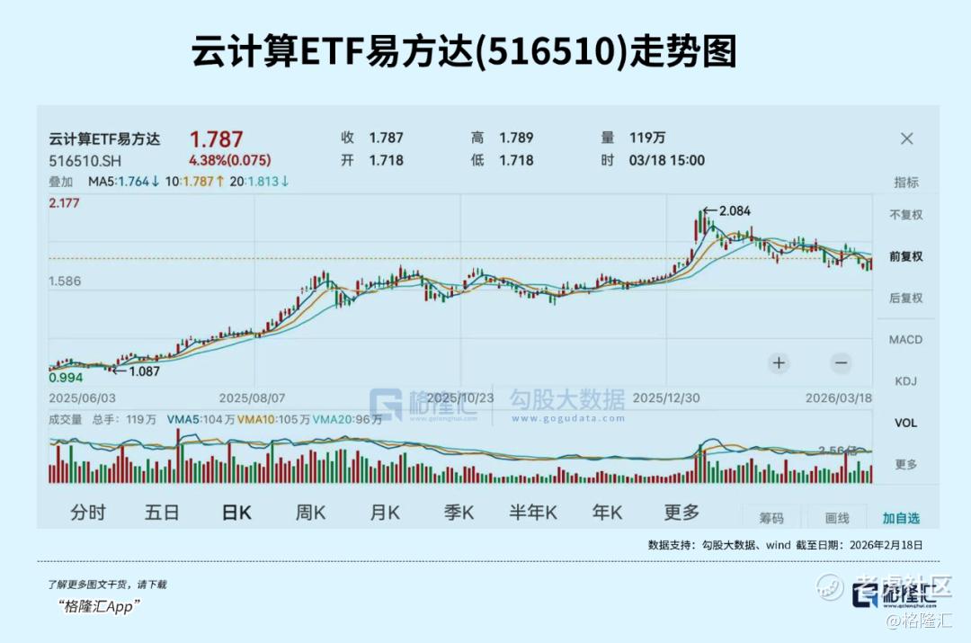 云计算ETF易方达(516510)最新规模25.64亿元,居同标的ETF第一,综合费率0.2%/年,同类最低,助力投资者低成本布局云计算产业链龙头;其跟踪中证云计算与大数据主题指数,标的指数囊括AI上游基建、中游模型、下游应用,成份股覆盖光模块龙头中际旭创、新易盛;电子终端及组件龙头中科曙光、浪潮信息;软件开发龙头科大讯飞、金山办公;IT服务紫光股份、润和软件等公司。