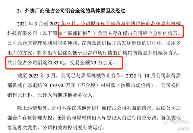 2021年3月至2022年9月,外协供应商嘉都机械负责人与公司原仓库管理员合谋,盗取公司铝合金锭83吨,涉案金额79万余元,长达18个月未被发现,这是公司内控失效的最直接证据。此次事件首先暴露公司仓管岗位未分离,仓库管理员既管收货又管发货,缺乏监督;二是存货盘点制度形同虚设,长期未进行全面盘点;三是对外协供应商管理失控,未建立有效的供应商监督机制。
