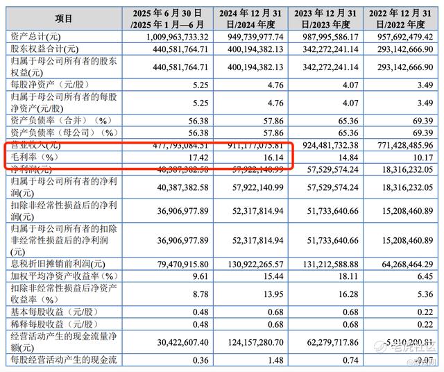 从经营数据来看,安达股份报告期(2022年-2024年、2025年1-6月)的业绩呈现“营收稳中有增、利润大幅反弹”的特征。2022年营收7.71亿元,归母净利润1831.62万元;2023年营收9.24亿元,归母净利润5752.96万元,同比暴涨214.13%;2024年营收9.11亿元,归母净利润5792.21万元,保持稳定;2025年上半年营收4.78亿元,归母净利润4038.74万元,延续盈利态势。