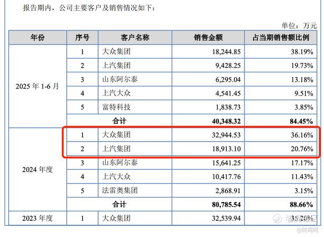 报告期内,安达股份对前五大客户的销售收入占营业收入的比例分别为87.65%、87.35%、88.66%、84.45%,长期稳定在85%以上,远高于同行业可比公司50%-60%的平均水平。公司前五大客户为大众集团、上汽集团、山东阿尔泰、上汽大众、中国一汽,其中大众集团、上汽集团两大客户收入占比合计超过50%,对单一客户的依赖度极高。