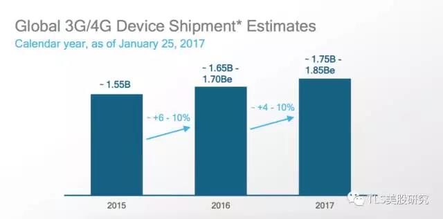 长远来看,无线行业正在积极开发和标准化5G技术,这是将于2019年开始商业部署的下一代技术。纳入了4G的创新,5G将支持更快的数据速率和更宽的频谱宽带,并有望应用于远程医疗程序、自主车辆、超高清 (4K) 视频等应用。不仅如此,智能手机的销量,也随着随3G/4G LTE多模连接的发展,在全球范围内巨大增长。