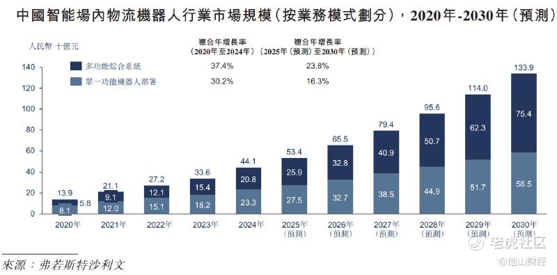 公司及行业介绍:头婚股,主业是物流机器人,排名行业第五,2024年市场份额是1.6%。物流机器人分为两类:一类是多功能综合系统,这个市场的规模预计将从2020年的81亿元提升到2030年的585亿元,2020-2024复合增速37.4%,2025-2030复合增速23.8%;另一类是单一功能机器人,这个市场的规模预计将从2020年的139亿元提升到2030年的754亿元,2020-2024复合增速为30.2%,2025-2030复合增速为16.3%。市场规模增长还是比较快的。