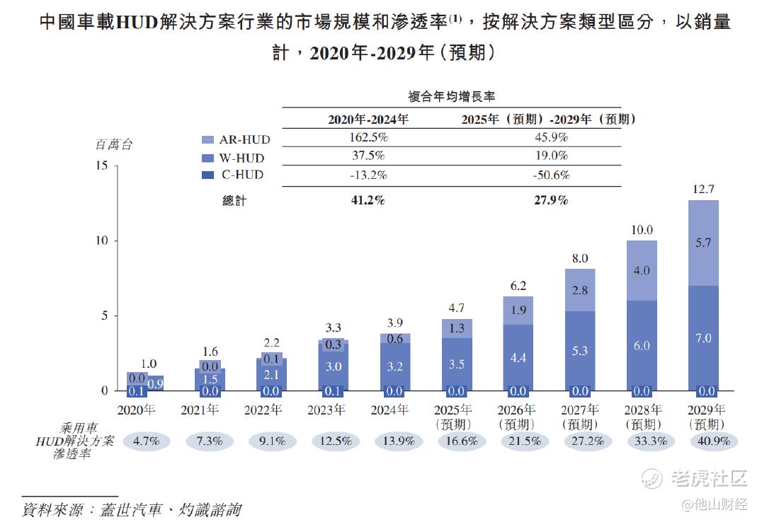 公司及行业介绍:头婚股,主业是车载抬头显示器(HUD),行业前景不错。按销量计算,中国车载 HUD 解决方案市场规模由 2020 年的 100万台增长至 2024 年的390万台,期间复合年均增长率为 41.2%;伴随座舱全面智能化和车载 HUD 解决方案渗透率提升等趋势,预计到 2029 年,中国车载 HUD 解决方案将增至 1270万台,2025 年至 2029 年复合年均增长率为 27.9%。