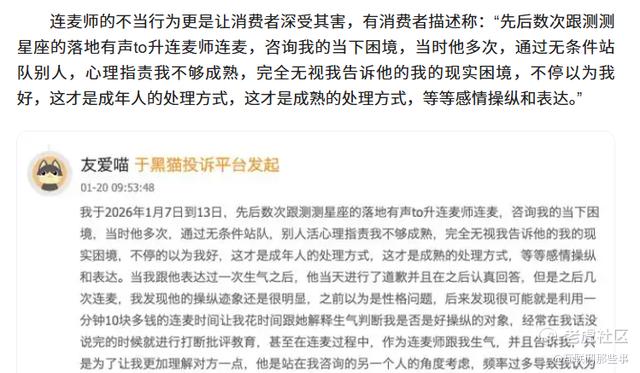 “先后数次跟测测星座的落地有声to升连麦师连麦,咨询我的当下困境,当时他多次,通过无条件站队别人,心理指责我不够成熟,完全无视我告诉他的我的现实困境,不停以为我好,这才是成年人的处理方式,这才是成熟的处理方式,等等感情操纵和表达。”