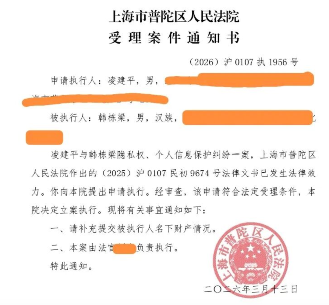凌建平诉韩栋梁隐私权、个人信息保护纠纷(案号:(2025) 沪 0107 民初 9674 号),2025 年 8 月 23 日判决生效,法院认定韩栋梁存在侵权行为,判令其公开道歉。