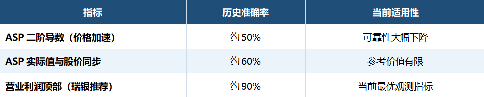 瑞银提出用“营业利润”替代传统ASP二阶导数。逻辑在于,营业利润不仅涵盖价格变化,还整合了出货量增长与单位成本下降,更接近行业真实经济状况的终值。历史数据显示:过去20年中,90%的情况下股价顶部与营业利润顶部同步或提前到来。